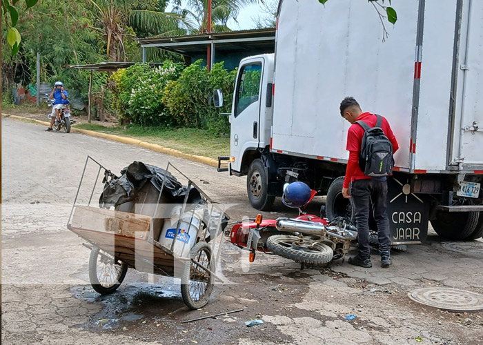 Un tremendo susto se llevó el conductor de una motocicleta que circulaba de este a oeste en una de las calles del barrio Carlos Aguilar, en la ciudad de Rivas. El hombre, identificado como Lorenzo Cardoza Altamirano, aseguró que no pudo evitar impactar con el camión que circulaba en sentido contrario, es decir; de norte a sur.