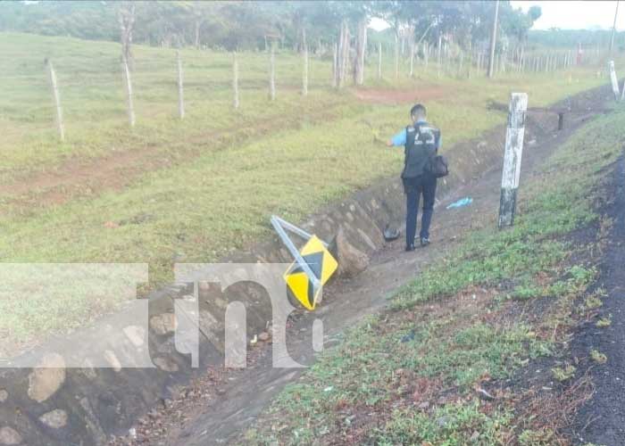 Tanto la camioneta como la motocicleta cogieron con dirección hacia Bluefields, sin embargo al momento de transitar la curva que se encuentra frente a la finca de la familia Bravo, según el conductor de la motocicleta; perdió el control del liviano vehículo, saliéndose de la carretera e impactando con una señal de tránsito.