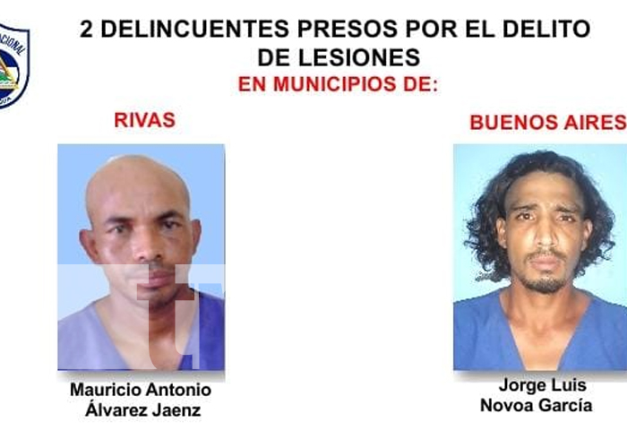 Mauricio Antonio Álvarez Jaénz, de Rivas, y el bonaerense Jorge Luis Novoa García, son señalados por el presunto delito de lesiones; estos y los demás detenidos ya están a la orden de las autoridades competentes para su debido proceso judicial.