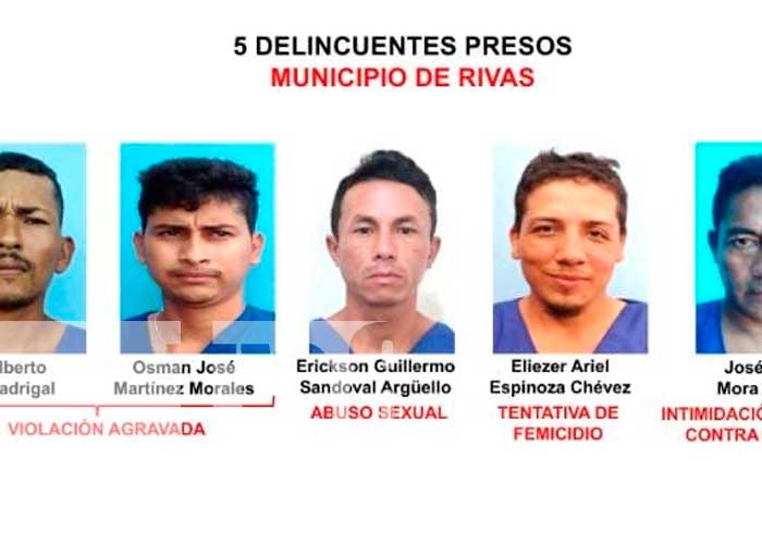En este sentido están detenidos Luis Alberto Terry Madrigal y Osman José Martínez Morales, acusados por el delito de violación agravada. Erickson Guillermo Sandoval Argüello por delito sexual, Eliezer Ariel Espinoza Chévez, acusado por tentativa de femicidio; mientras José Noel Mora Guido, acusado por el delito de intimidación y amenazas contra la mujer, todos son originarios del municipio de Rivas.