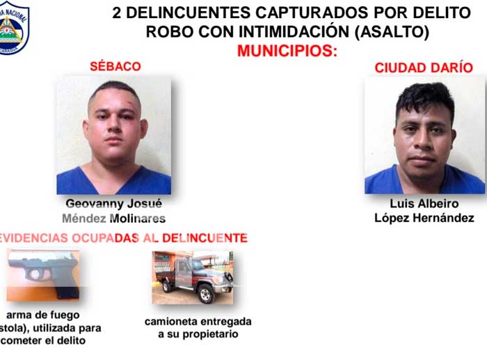 Los capturados por robo con intimidación tipo asalto corresponden a los nombres de: Michael Alexander Hernández García, Arlen Antonio Mendoza Figueroa, Geovanny Josué Méndez Molinares, Juan José Osabas Callejas y Luis Albeiro López Hernández; mientras que por el delito de delito de robo con fuerza está Mario Zeledón Urbina.