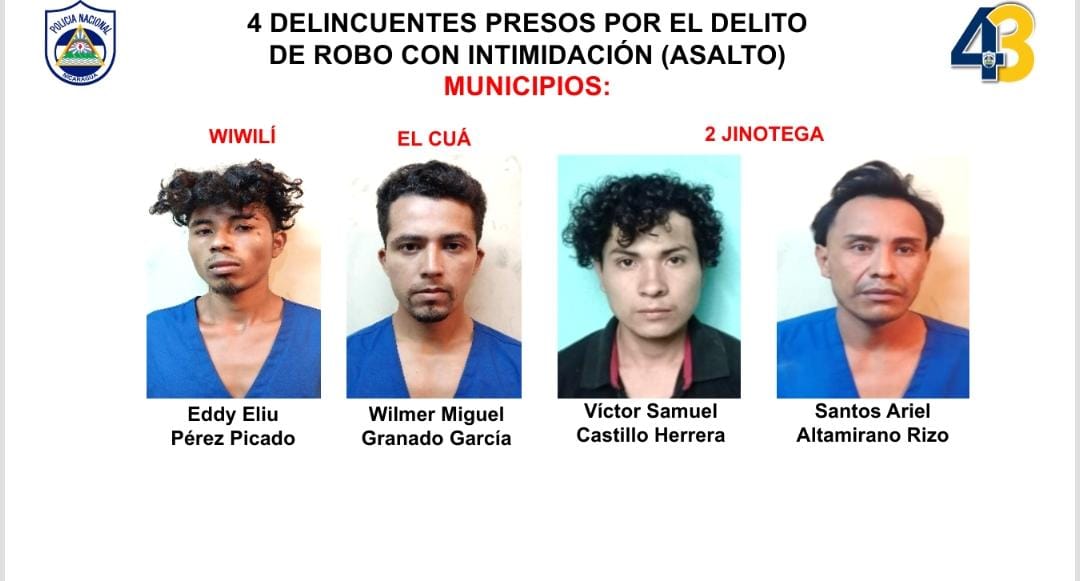 Por el delito de robo con intimidación asalto en el municipio de Wiwili, se capturó a Eddy Eliu Pérez Picado, y en El Cuá, Wilmer Miguel Granado García. Asimismo, se detuvo a 2 sujetos en el municipio de Jinotega que responden a los nombres de; Víctor Samuel Castillo Herrera y Santos Ariel Altamirano Rizo.