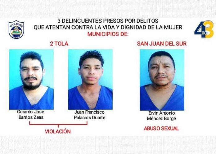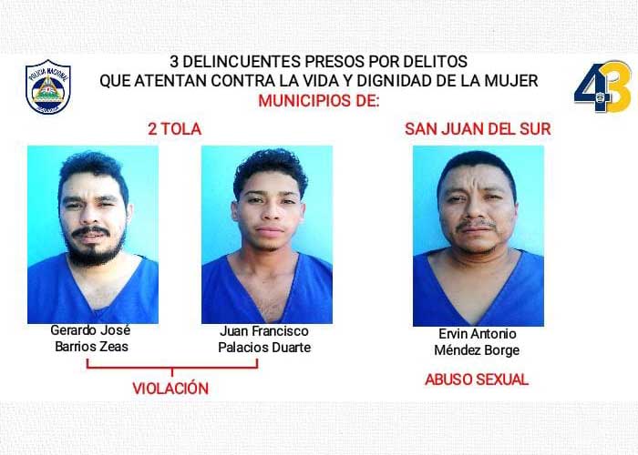 Mientras que por presuntamente atentar contra la vida y la dignidad de las mujeres fueron detenidos por la policía; Gerardo José Barrios Zeas y Juan Francisco Palacios Duarte, ambos originarios del municipio de Tola y señalados por el supuesto delito de violación. Juntos a ellos está tras las rejas el sanjuaneño Ervin Antonio Méndez Borge; acusados por el aparente delito de abuso sexual.