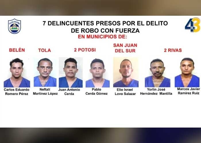 Mientras que por el delito de robo con fuerza permanecen tras las rejas Carlos Eduardo Romero Pérez de Belén,NeftalíMartínezLópez de Tola, Juan Antonio Cerda y Pablo Cerda Gómez; originarios del municipio de Potosí, Elio Israel Lovo Salazar de San Juan del Sur. Y, en Rivas a Yorlin José Hernández Mantilla y Marcos Javier Ramírez Ruiz; a quienes se les ocupó 2 motocicletas que habían sustraído de las viviendas de sus víctimas.