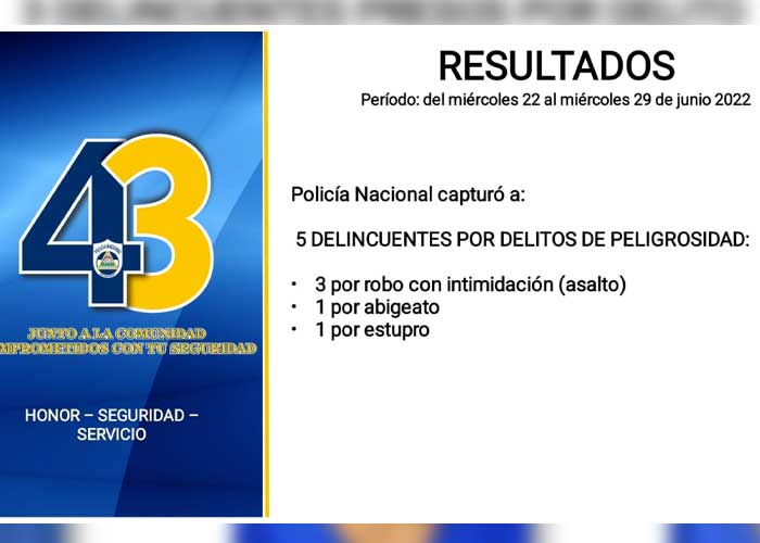 Además, detalló la captura que Leonel Antonio González Vivas, Lesther Enrique Téllez Mendoza y Jankel José Jaime Fernández; por el supuesto delito de robo con intimidación, en el municipio de Juigalpa.