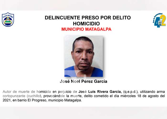 De igual manera se capturó a José Noel Pérez García, presunto autor de la muerte homicida en perjuicio de José Luis Rivera García, (q.e.p.d.). El cual utilizando arma cortopunzante (cuchillo), le provocaron la muerte. Delito cometido el miércoles 18 de agosto del 2021, en barrio El Progreso, municipio Matagalpa.