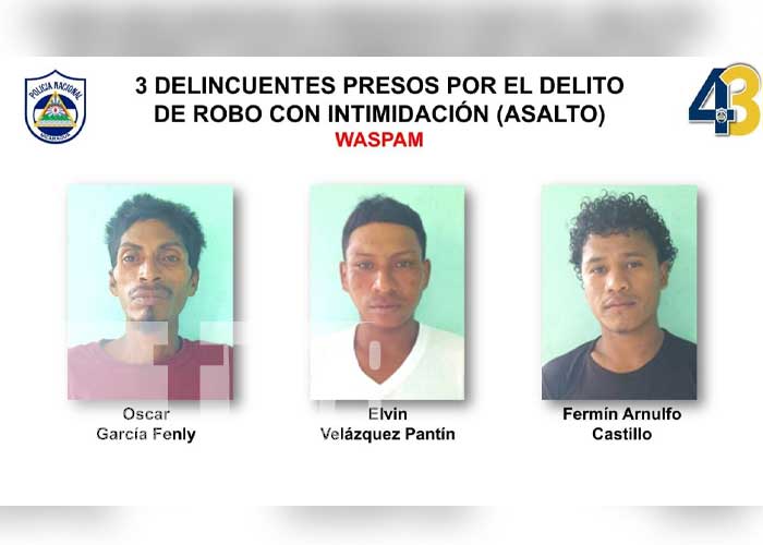 «Así también se encuentran en las cárceles preventivas de Bilwi, tres sujetos de Waspam señalados por el delito de asalto y otros tres sujetos de Bilwi acusados; también por asalto, identificados como Aniceto Henry Rojas, Becker Joseph Ignacio y Joyner Jefferson Jacobo; mientras que Oscar García Fenly, Elvin Velázquez Pantín y Fermín Arnulfo Castillo son del municipio de Waspam»; destaca el Jefe policial.