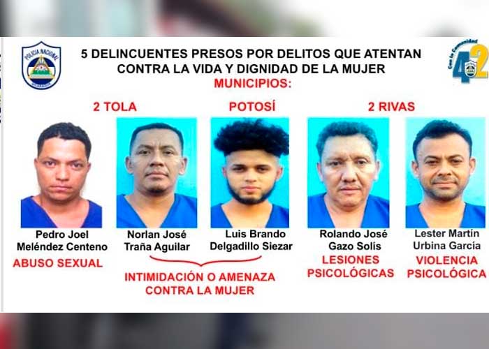 Por delitos que atentan contra la vida y la dignidad de las mujeres, se detuvo a Pedro Joel Meléndez Centeno de Tola (abuso sexual); Norlan José Traña Aguilar también de Tola y el potosino Luis Brandon Delgadillo Siezar. Ambos por el delito de intimidación o amenazas contra la mujer.