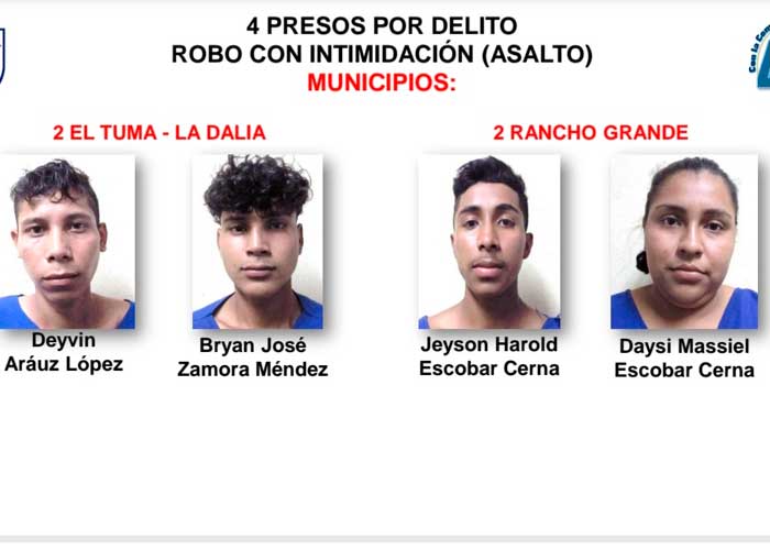 Estos delincuentes fueron identificados como: Deyvin Aráuz López, Jeyson Harold Escobar Cerna, Bryan José Zamora Méndez, Daysi Massiel Escobar Cerna, a ellos se les acusa de cometer robo con intimidación.