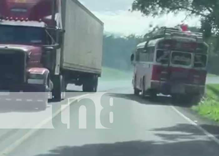 La irresponsabilidad de algunos conductores no tienen límites; en un video que ha sido difundido en las redes sociales se aprecia el momento exacto cuando un conductor de un bus aventaja otro y casi impacta de manera frontal contra un furgón, en la famosa y temida cuesta La Cucamonga, Estelí.