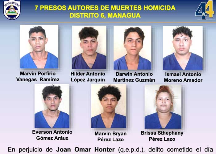 Marvin Vanegas Ramirez, Hilder López Jarquin, Darwin Martínez Guzmán, Isamel Moreno Amado, Everson Gómez Aráuz; Marvin Pérez Lazo y la única mujer Brissa Pérez Lazo, han sido presentados por las autoridades; por ser presuntos autores de la muerte de Joan Omar Honter, un hecho sangriento que ocurrió el pasado 5 de agosto en el barrio Canadá Sur, del Distrito 6 de Managua.