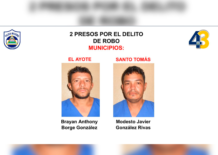 De igual manera la Policía Capturó a otros dos ciudadanos por el aparente delito de robo; sus nombnres corresponden a Brayan Anthony Borge González de El Ayote, y Modesto Javier González Rivas de Santo Tomás.