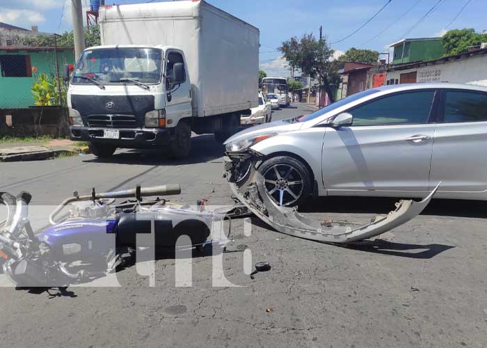 La aparente prisa y el irrespeto a la señal de Alto fueron los supuestos motivos que provocaron que el conductor de un carro se pasara llevando a un motociclista, frente a coctelería Fuente de Vida, en Managua.