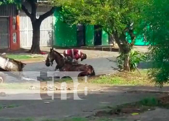 Quizá por la larga jornada laboral y por el peso que tenía que arrastrar, un caballo se desplomó en medio de una calle en Managua. Esto llevó a su dueño a tomar medidas para que continuara su marcha, por lo que procedió a golpearlo y halarlo por la cola.