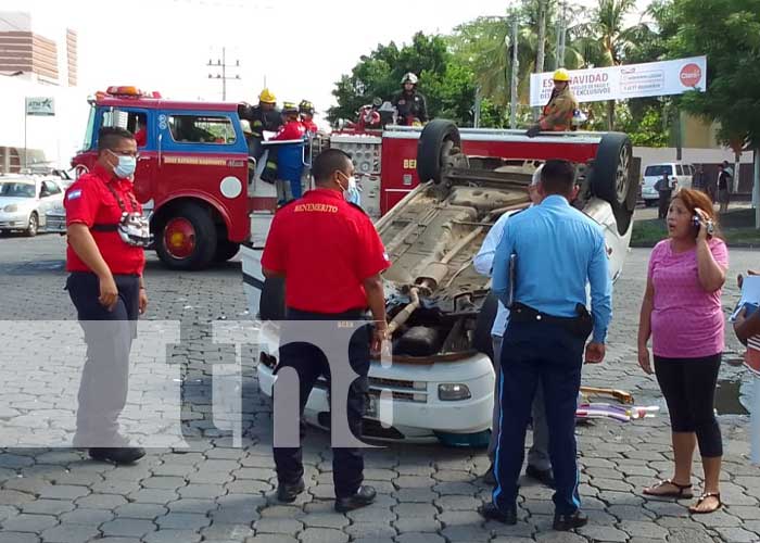Dos taxistas mayores a los 70 años, protagonizaron un violento accidente de tránsito que dejó un vehículo volcado y otro con daños en los semáforos del antiguo Banco Popular de Monseñor Lezcano, Managua.