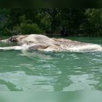 Los habitantes de las orillas del río Huamual en Indonesia han quedado boquiabiertos tras ver el cadáver gigante de un animal no identificado.