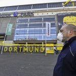 Un elemento de seguridad vigila en la entrada principal del Signal Iduna Park, el estadio más grande de la Bundesliga alemana y casa del...