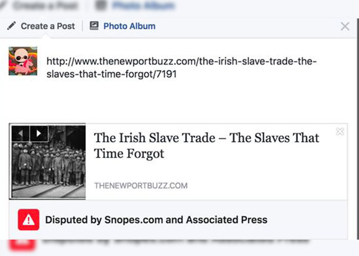 La primera publicación con la que los usuarios pudieron ver la herramienta en acción fue con una noticia que falsamente informaba que cientos de miles de inmigrantes irlandeses habían llegado a los Estados Unidos como esclavos. Debajo de la publicación había una alerta en rojo que decía que el contenido era cuestionado por Snopes.com y Associated Press (AP).