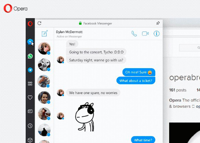¿Buscabas alguna buena excusa para darle una oportunidad a Opera? Quizás estemos a punto de dártela. Los creadores del navegador han anunciado a través de su blog oficial que la nueva versión de su solución vendrá con WhatsApp, Telegram y Facebook Messenger integrados, tres importantes y populares plataformas de comunicación cada vez más usadas también a través del PC. Y es que aunque estos servicios pueden usarse mediante sus respectivas aplicaciones desde el escritorio, resulta interesante que un navegador las añada a modo de extensión por defecto, para que con un solo clic accedas a tus conversaciones sin necesidad de tener más apps abiertas.