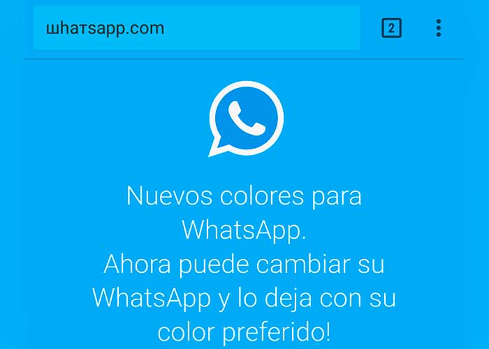 Primero el usuario recibe un mensaje invitándolo a probar WhatsApp en diferentes colores con un enlace a http://????????.com/?colors