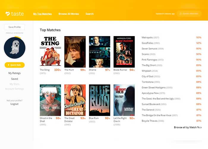 Taste.io es una plataforma que nos recomendará películas que encajen a la perfección con nuestros gustos. Una vez que entremos en la web nos pedirá que puntuemos una serie de films con cuatro notas diferentes: mala, meh, buena e impresionante.