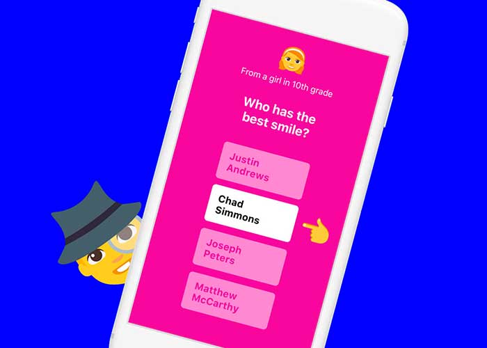 Una vez que el usuario carga sus contactos en la aplicación, TBH le hace preguntas predeterminadas, como por ejemplo: "¿Quién es el mejor para llevar a una fiesta?" , ofreciendo cuatro amigos para que seleccione a uno de ellos.