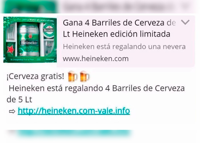 En los últimos días se viralizó un mensaje por WhatsApp que dice que Heineken ofrece 4 barriles de cerveza gratis a quien participe de una encuesta siguiendo un link que acompaña el texto. Se trata de un engaño.