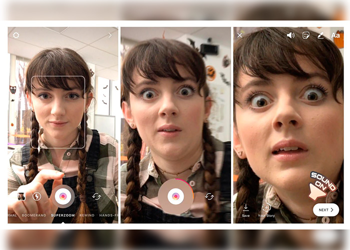 Al seleccionar Superzoom, Instagram hará el zoom automático y podrás agregar música de suspenso preseleccionada en el app. Los videos con Superzoom se pueden publicar en Instagram como un mensaje o un video en Stories.