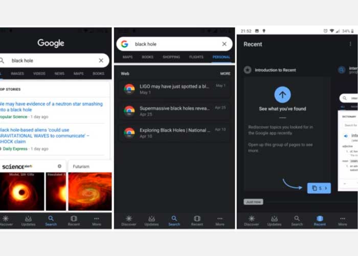 Además de las pistas que va dejando sobre este modo oscuro nativo, Google lleva tiempo haciendo que todas sus apps propietarias vayan pasándose a la nueva modalidad. La última en llegar es Search, la app de búsqueda de Google que podemos invocar desde la barra de búsqueda del escritorio y que ya se prepara para liberar el modo oscuro. Un apk filtrado antes de tiempo así lo muestra.