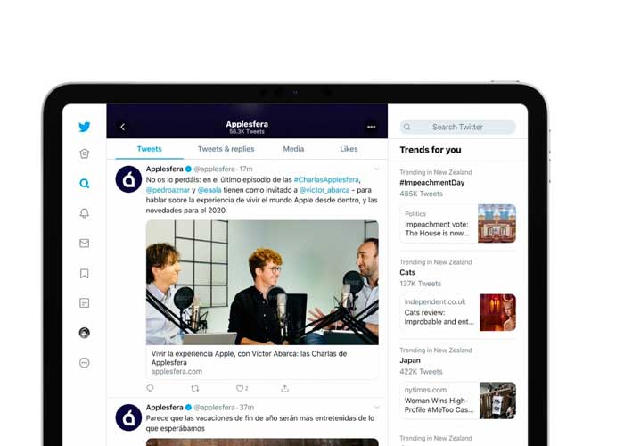Este nuevo formato continúa dando buena parte del protagonismo al feed principal que estemos visualizando en cada momento dado. A diferencia del anterior, no obstante, cuenta ahora con una columna lateral en la que se muestra parte de los añadidos que sí vemos en el reciente diseño web, como son las sugerencias de gente a la que seguir, bien los icónicos trending topics o el campo de búsqueda ahora siempre visible y disponible.