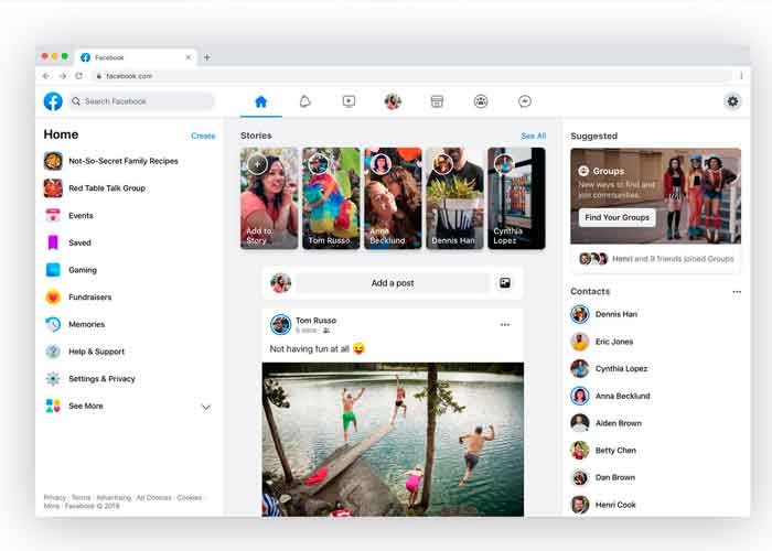 El aspecto renovado de Facebook incluye una nueva pestaña de Grupos, que muestra un feed personalizado de la actividad de los grupos que sigue el usuario. También cuenta con una nueva herramienta de descubrimiento con recomendaciones sobre grupos que pueden ser de interés.