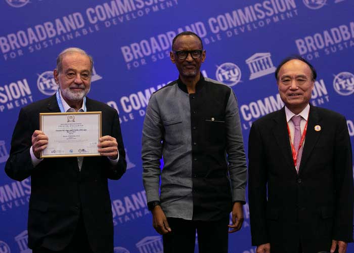 El Ing. Carlos Slim Helú recibió el premio por parte del Secretario General de la UIT, Houlin Zhao, durante su participación como Copresidente de la Comisión de Banda Ancha de la Unión, ante el pleno de los comisionados y el presidente de Ruanda, Paul Kagame; quienes llevan a cabo en Kigali la reunión anual de primavera del organismo, bajo el título «Impulsar la transformación digital inclusiva».