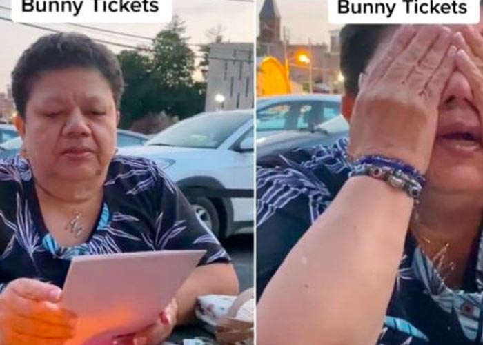 Al momento en que la mujer lee el texto, se da cuenta que en el interior del sobre también vienen unos boletos para ver a Bad Bunny en su “World Hottest Tour”; en agosto próximo.