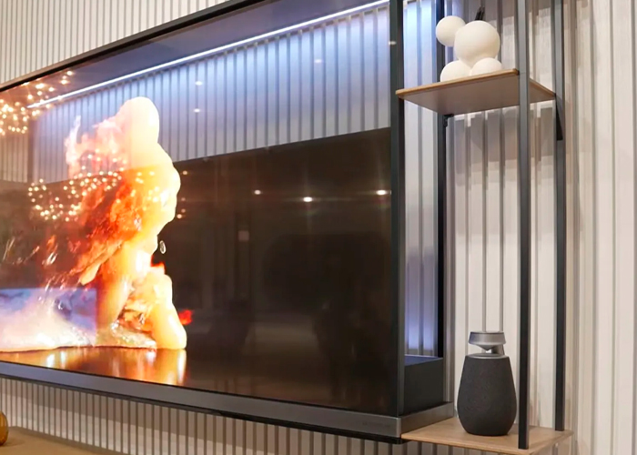De repente, una especie de cortina negra se desliza lentamente y la pantalla se vuelve transparente. El objetivo es que así el aparato pueda colocarse en el medio de una habitación y pasar desapercibido; aunque también puede mostrar peces u otras animaciones. Samsung no quiere quedarse atrás y ha aprovechado la feria para anunciar un televisor micro LED completamente transparente.
