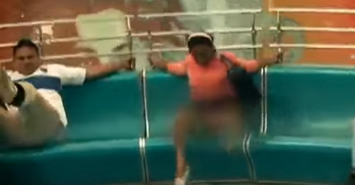 La mujer resistió durante unos segundos pero la falda se le empezó a levantar y esta tuvo que soltarse del mango de la máquina para poder bajarse la falda, sin embargo, al hacer esto cayó directo al medio del juego y al no poder controlarse se le vio el ‘alma’.