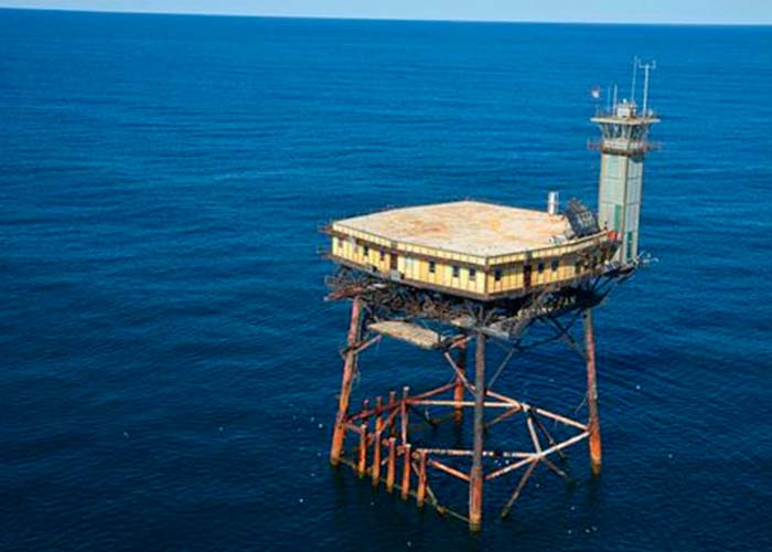 Sucede que el peculiar alojamiento se encuentra a 55 kilómetros de la costa de Southport, en Carolina del Norte, situado en el medio de la nada. O mejor dicho, en el medio de solo agua. Desde el lugar, el que asome la vista en cualquier dirección solo se encontrará con el panorama azul pintado por el mar. Lo particular y peligroso de la zona es que es azotada con frecuencia por huracanes, está rodeada de tiburones y es sólo alcanzable en helicóptero o barco.