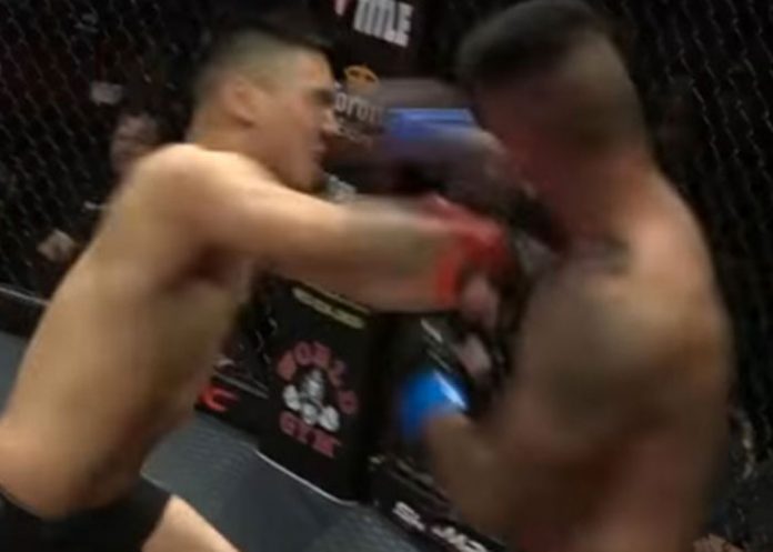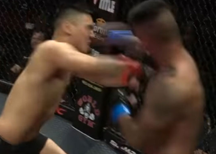 Luego de un par de movimientos los dos peleadores lanzaron sendos derechazos con todo éxito, los dos impactaron la cara de su rival, pero también recibieron un golpe.