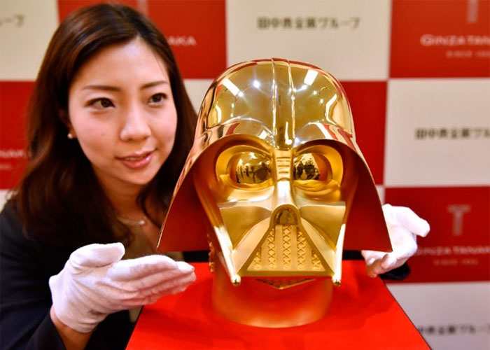 Una joyería japonesa pondrá a la venta por 154 millones de yenes (1,3 millones de euros) una réplica en oro del casco del personaje cinematográfico Darth Vader para conmemorar el 40º aniversario del estreno de la primera entrega de Star Wars (La Guerra de las Galaxias).