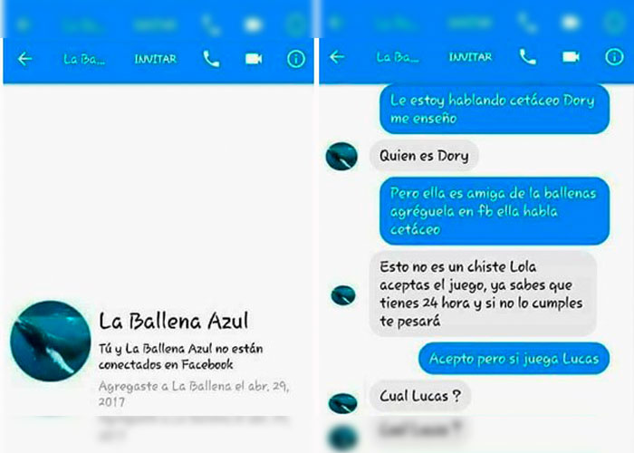 A través de Facebook, la página de “La ballena azul” pide a los usuarios cumplir varios desafíos en un día. Estos consisten por ejemplo en cortarse con una navaja, acercarse a un precipicio y por último suicidarse. El “elegido” tiene que enviar fotos como prueba.
