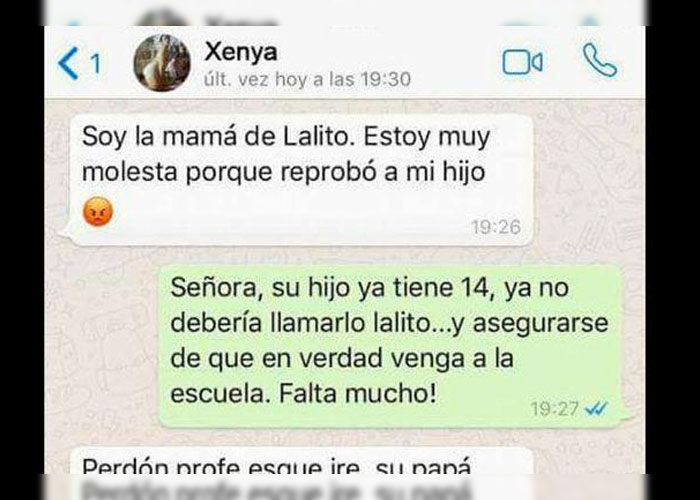 Como podrás observar en la galería, la conversación de WhatsApp inicia cuando la madre de “Lalito” le increpa al profesor por haber reprobado a su hijo. El maestro le dio las razones de su calificación y la actitud de la mujer cambió.