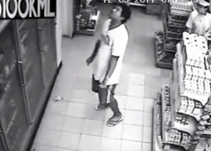 Luego de unos minutos, el sujeto que también emitía raros sonidos cayó al suelo y en el cristal del refrigerador se ve un reflejo al tiempo que algunos productos de los anaqueles vuelan sin ninguna explicación.