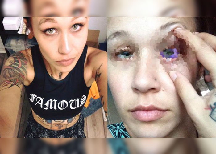 Según comenta la joven, el problema empezó días después del procedimiento; su globo ocular rechazó el líquido púrpura que se le había inyectado. Tras ello, acudió al hospital, donde le dieron una dosis de gotas antibióticas.