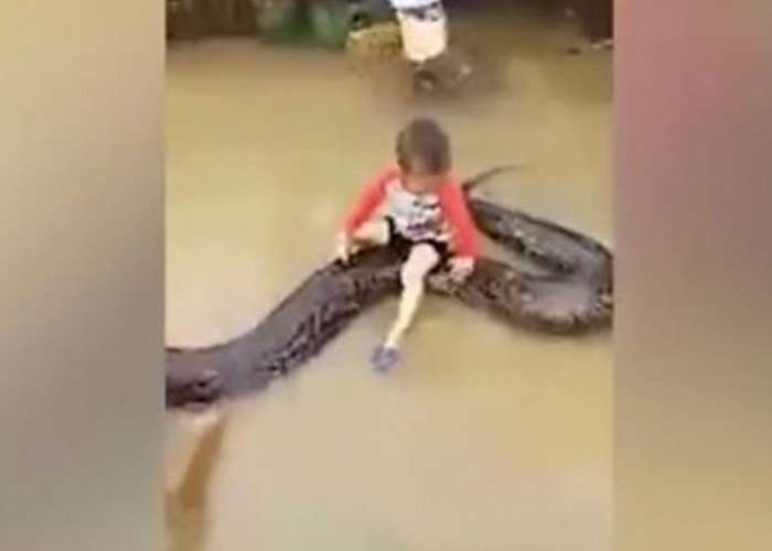 Pequeño subió al lomo de una enorme pitón y las imágenes circulan por todo el mundo.