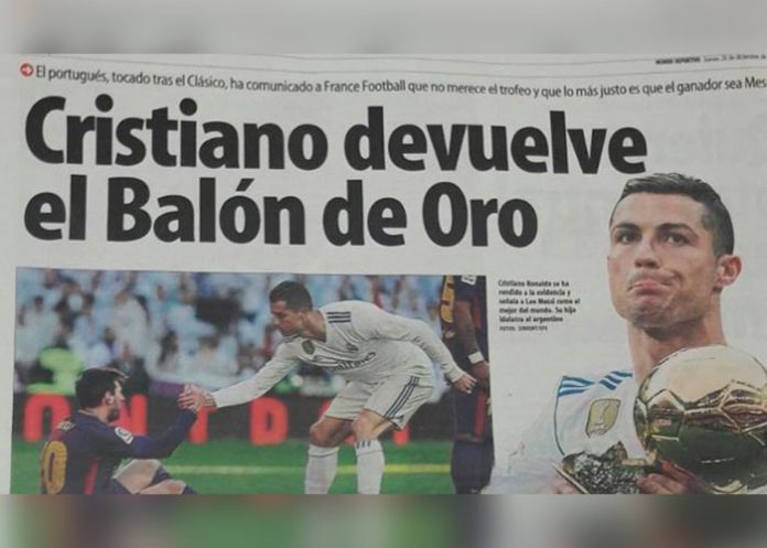 A más de uno se le habrá caído el café sobre las páginas de Mundo Deportivo esta mañana al leer el siguiente titular: “Cristiano devuelve el Balón de Oro”. Las primeras líneas de la noticia ya hacen sospechar -a aquellos ingenuos que no han tenido suficiente con el titular- que se trata de una inocentada más. Y es que al parecer el portugués salió “muy tocado” del clásico y “nada más acabar el partido, advirtió a sus compañeros que no merecía el Balón de Oro y que lo quería devolver”. Igual de poco creíbles son las palabras que Ronaldo le dedica al director de France Football: “Me precipité diciendo que soy el mejor de la historia, todo el planeta ha presenciado una vez más que el mejor es Messi, lo más justo es que devuelva el Balón, no lo merezco”.