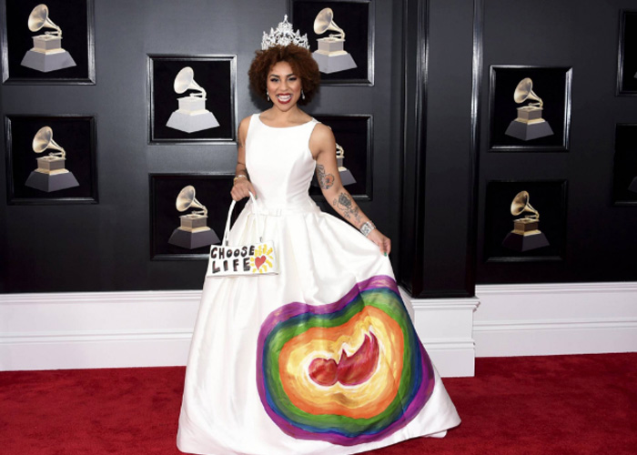 Por primera vez en 60 años, los vestidos no han sido lo más comentado de la alfombra roja de los Premios Grammy sino las rosas blancas que lucieron las estrellas en apoyo al movimiento #MeToo, de rechazo al acoso sexual. Salvo en un caso: el vestido antiabortista de la cantante de origen latino nacida en California Joy Villa. Si el año pasado llamó la atención por apoyar a Donald Trump en su indumentaria, en esta edición ha vestido un traje blanco de tirantes que terminaba con un dibujo de un feto dentro de una placenta arcoiris, acompañado de una enorme tiara y un bolso de mano con el lema Choose life (Elige la vida).