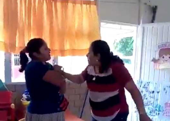 La dos empiezan empujarse hasta llegar a la puerta del que aparentemente es el salón de clases, mientras alguien grita "maestra, maestra".