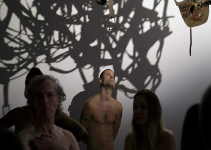 En traje de Adán y Eva, los 161 participantes recorrieron durante dos horas, antes de la apertura al público en general, todas las salas de la exposición "Discordia, hija de la noche".