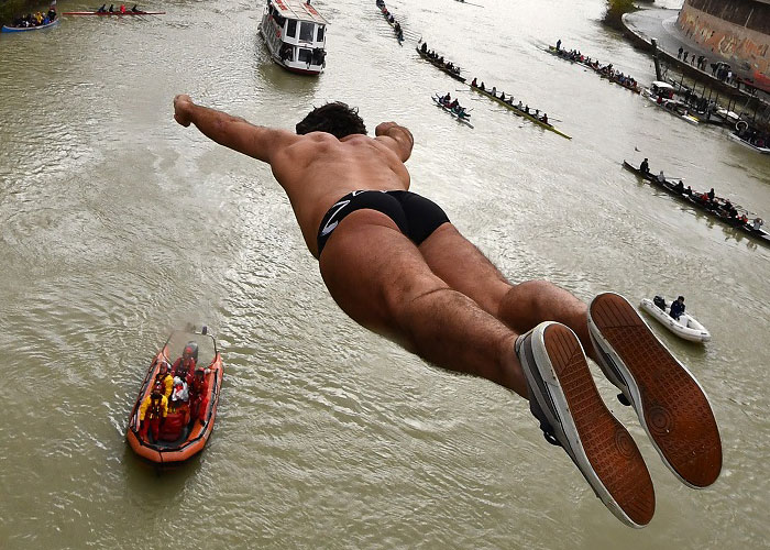 Como cada año, algunos valientes en bañador se lanzaron al agua del Tíber, cuya temperatura no superaba los seis grados, desde un puente en el centro de la capital italiana al mediodía, bajo un sol resplandeciente.