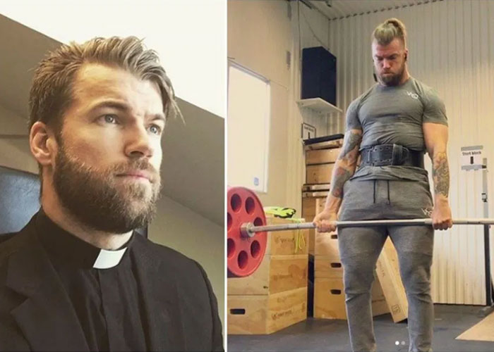 Entre las imágenes de Arngården oficiando bodas y posando con su alzacuellos en su parroquia aparecen los espectaculares fotos y vídeos de sus entrenamientos en el gimnasio.