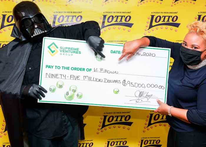 La vicepresidenta de Supreme Ventures, Gail Abrahams, le entregó el gran cheque de 95 millones de dólares. La compañía, desarrolla juegos de entretenimiento en todo el Caribe hace décadas.